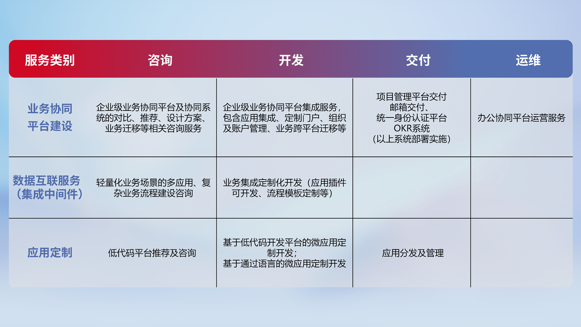 针对钉钉、、企微、、IDaas等平台级产品提供产品的规划、、、方案、、、交付、、定制化开发等服务,,实现如统一协同办公、、、智能客户服务、、混合会议管理、、、、智能数据查询、、、、等业务场景,,,实现数字化转型。。
