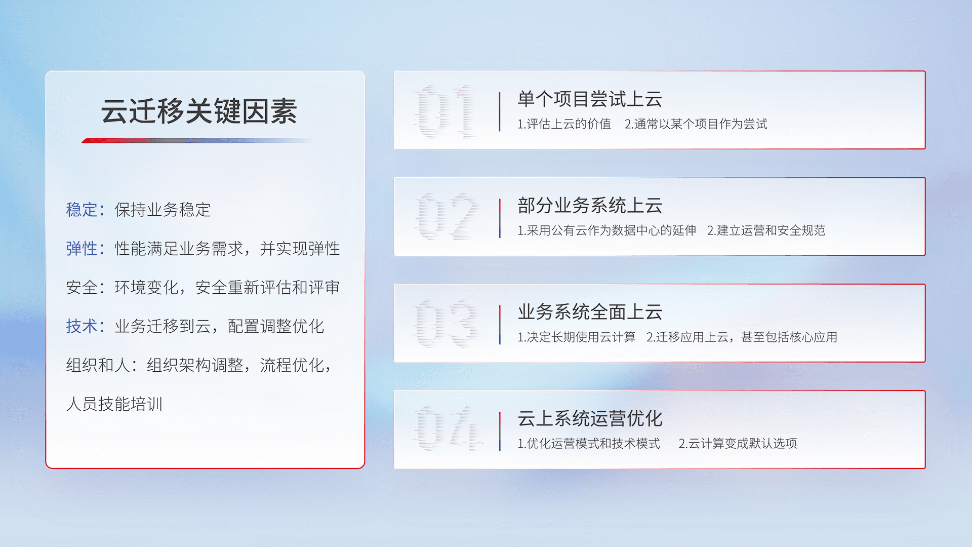 结合实际业务,,,,从规划设计、、云平台选型、、云原生改造、、、、数据迁移、、集成交付,,,,迁移全过程为客户识别最佳上云路径,,做好风险识别管理,,设计网络架构、、、身份权限、、、、安全审计合规、、、、操作审计、、、、日志审计、、、、监控告警策略、、、多站点容灾设计等,,,对云上基础设施进行整体规划,,,,提升IT治理水平,,以满足弹性、、、高可用、、高性能的需求。。
