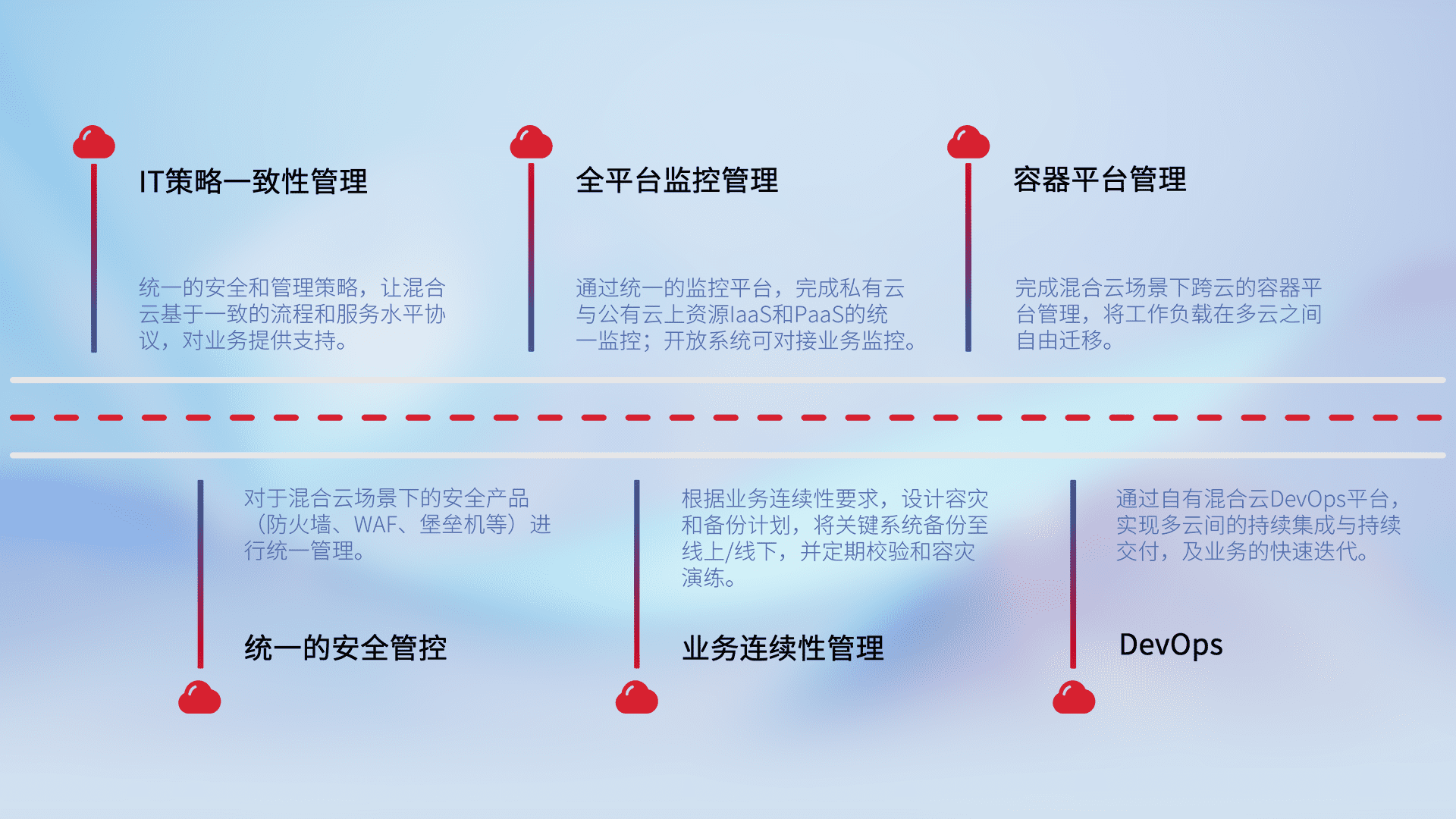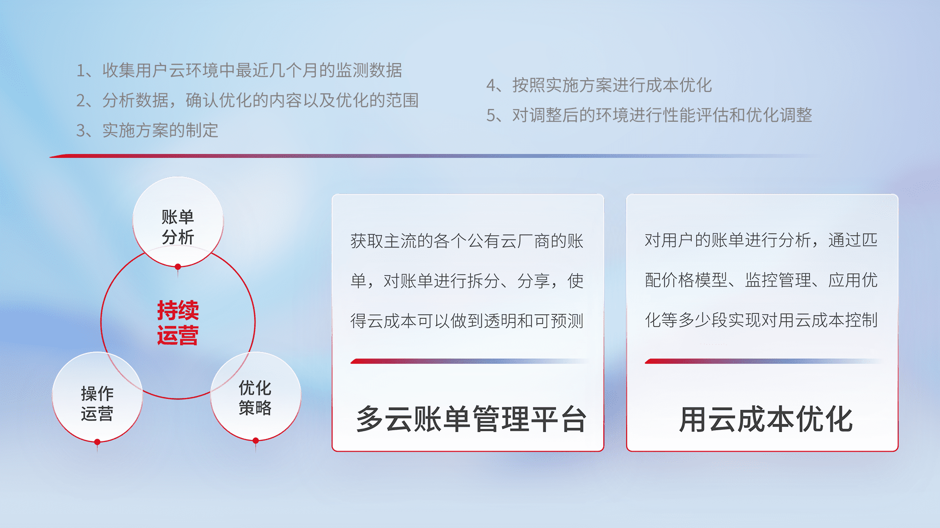 通过多云纳管,,,以统一的资源数据模型把客户的云资源进行抽象和封装,,,进而实现对多云资源的统一操作,,保障云资源管理的可靠性、、、稳定性与可用性。。。。量身定制化运维内容,,,,配置、、、、开发运维、、、、补丁管理、、、备份、、、监控、、认证和访问管理、、审计和日常巡检等,,保障在用云过程中的可靠度,,稳定度以及高可用率。。。